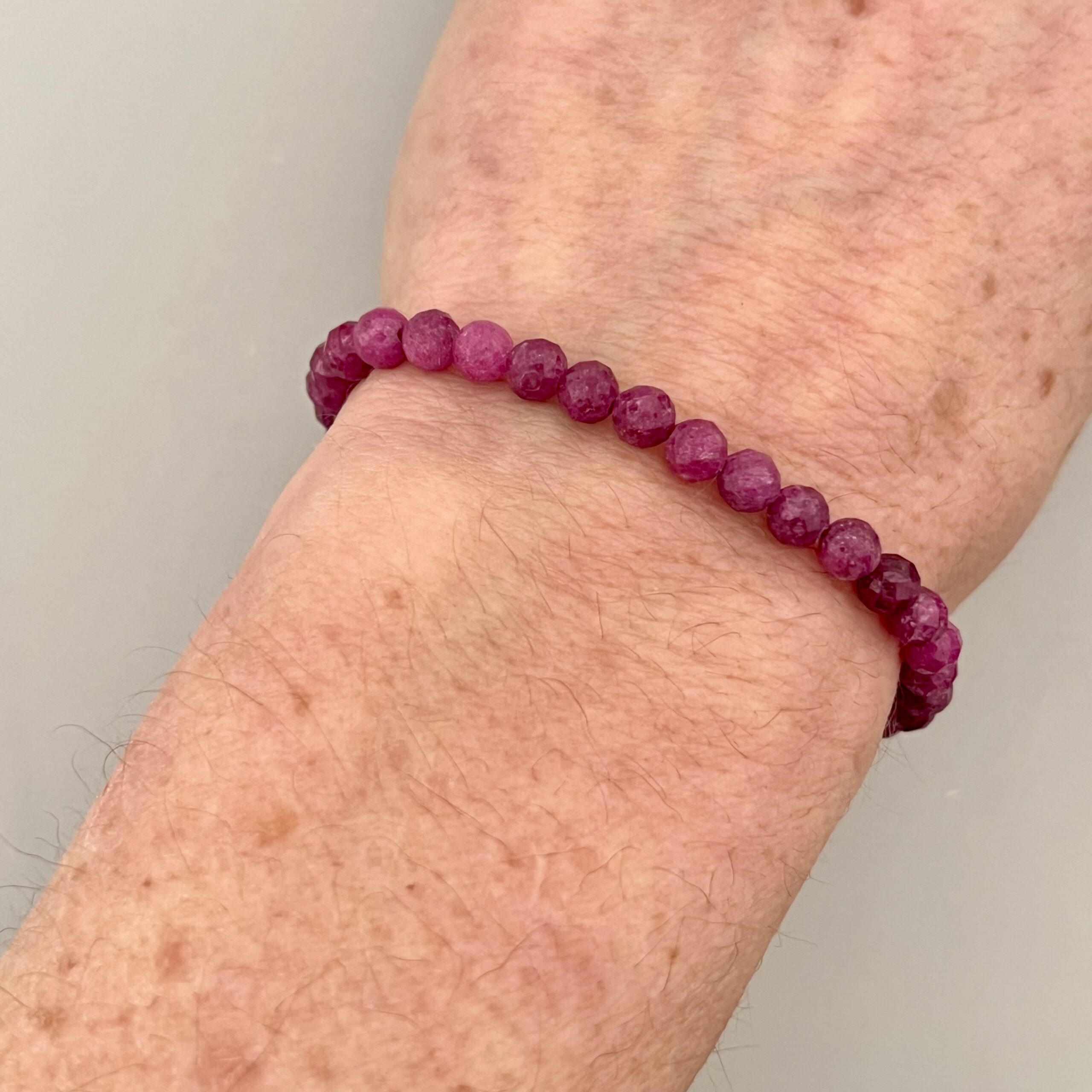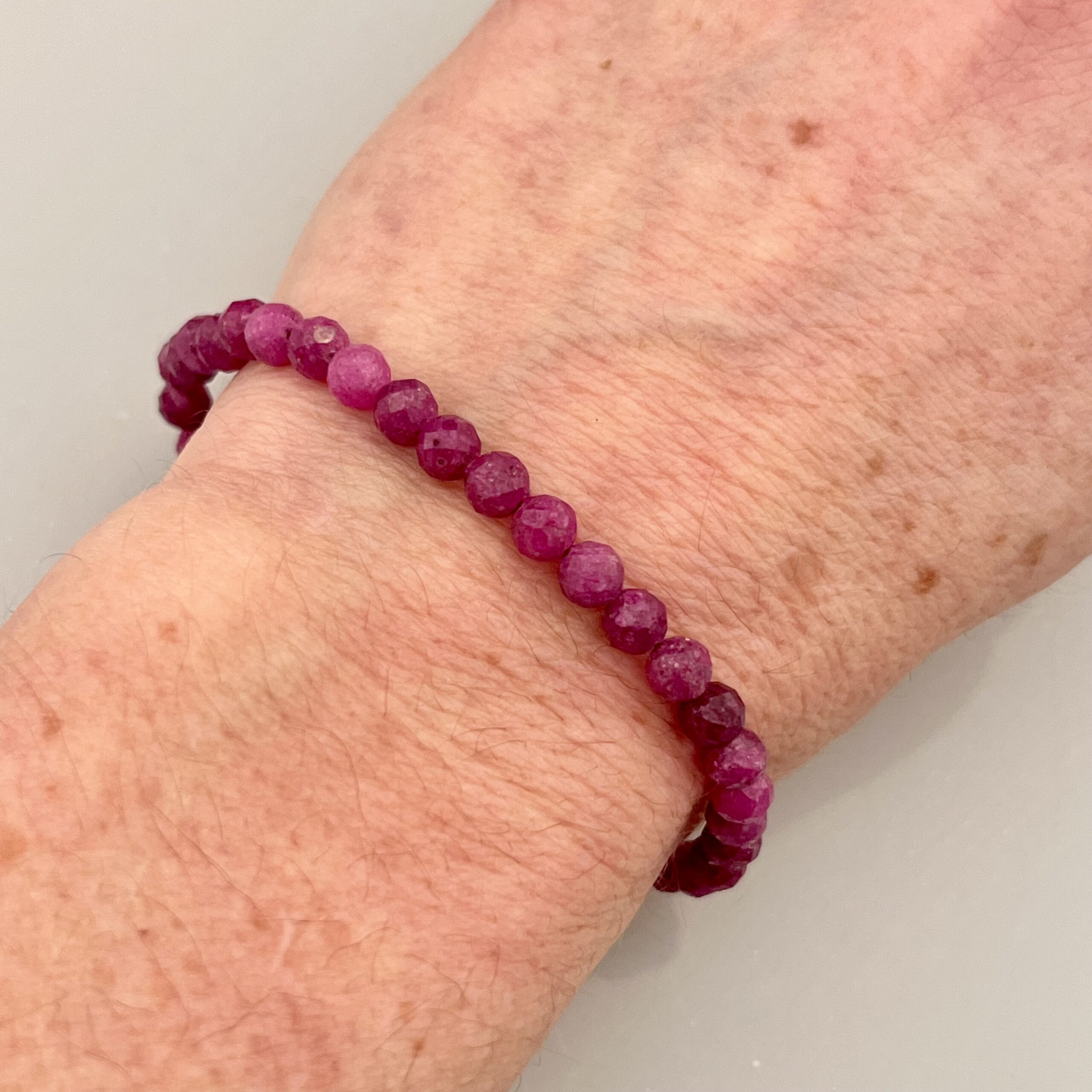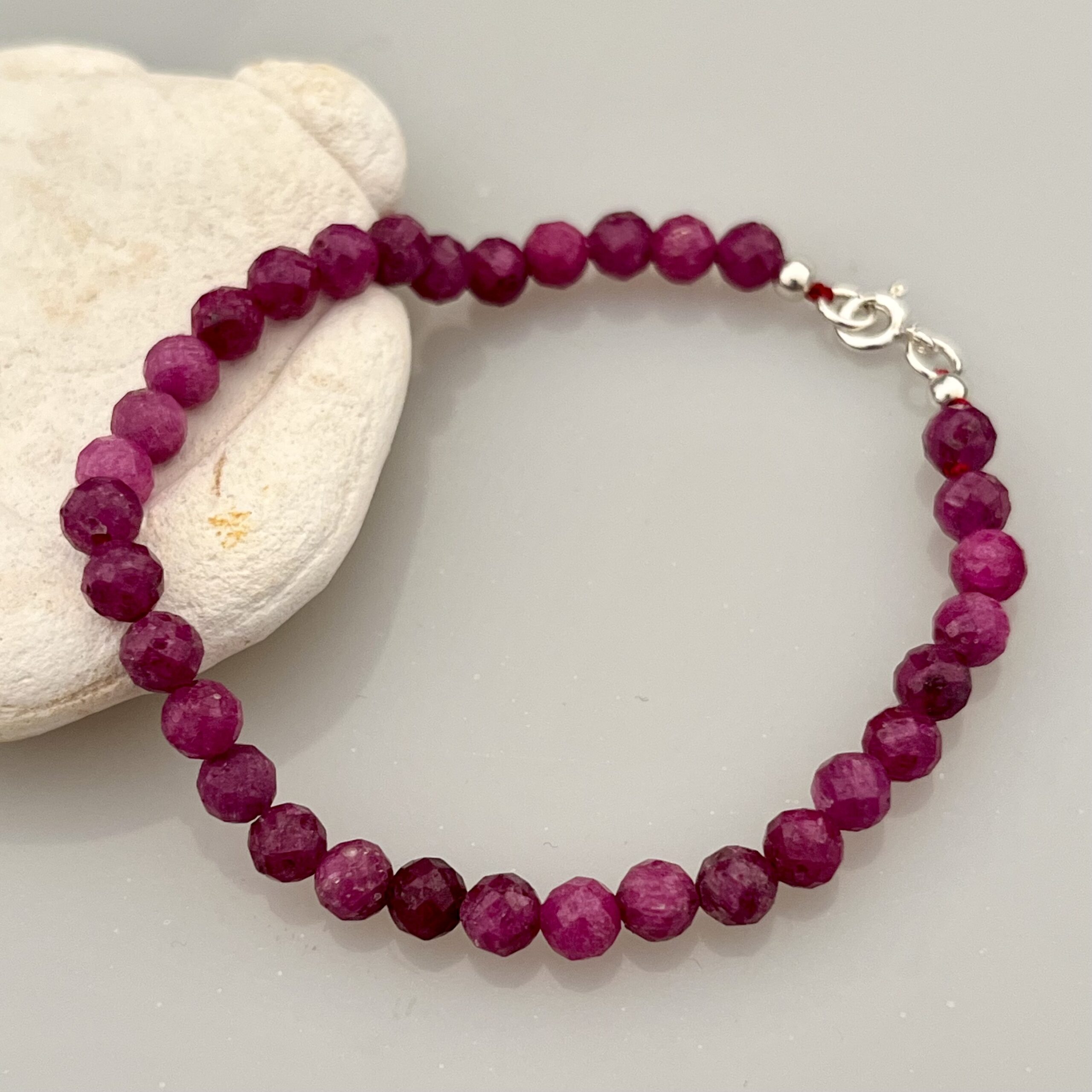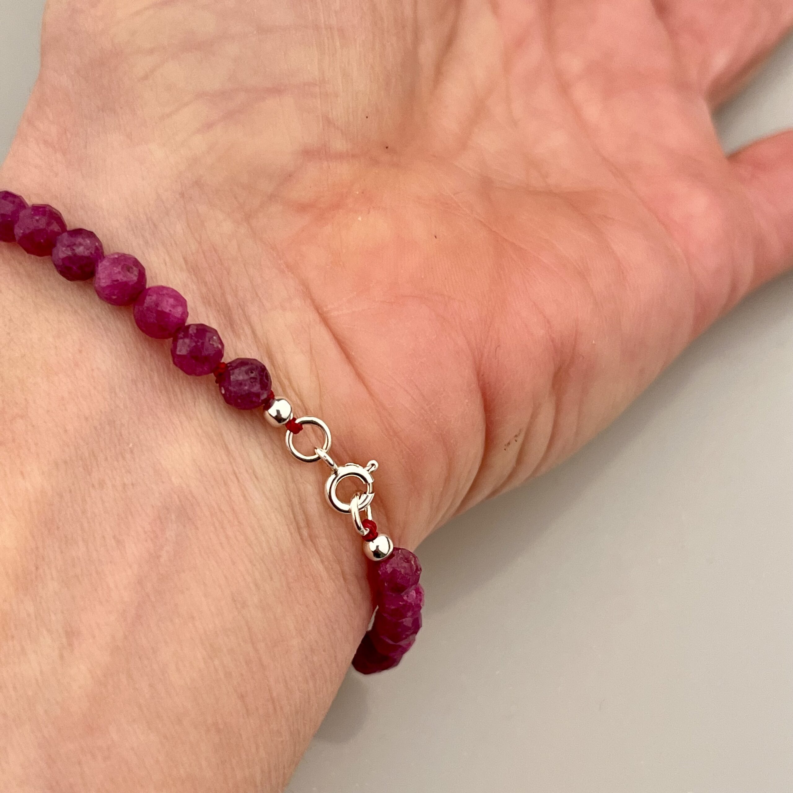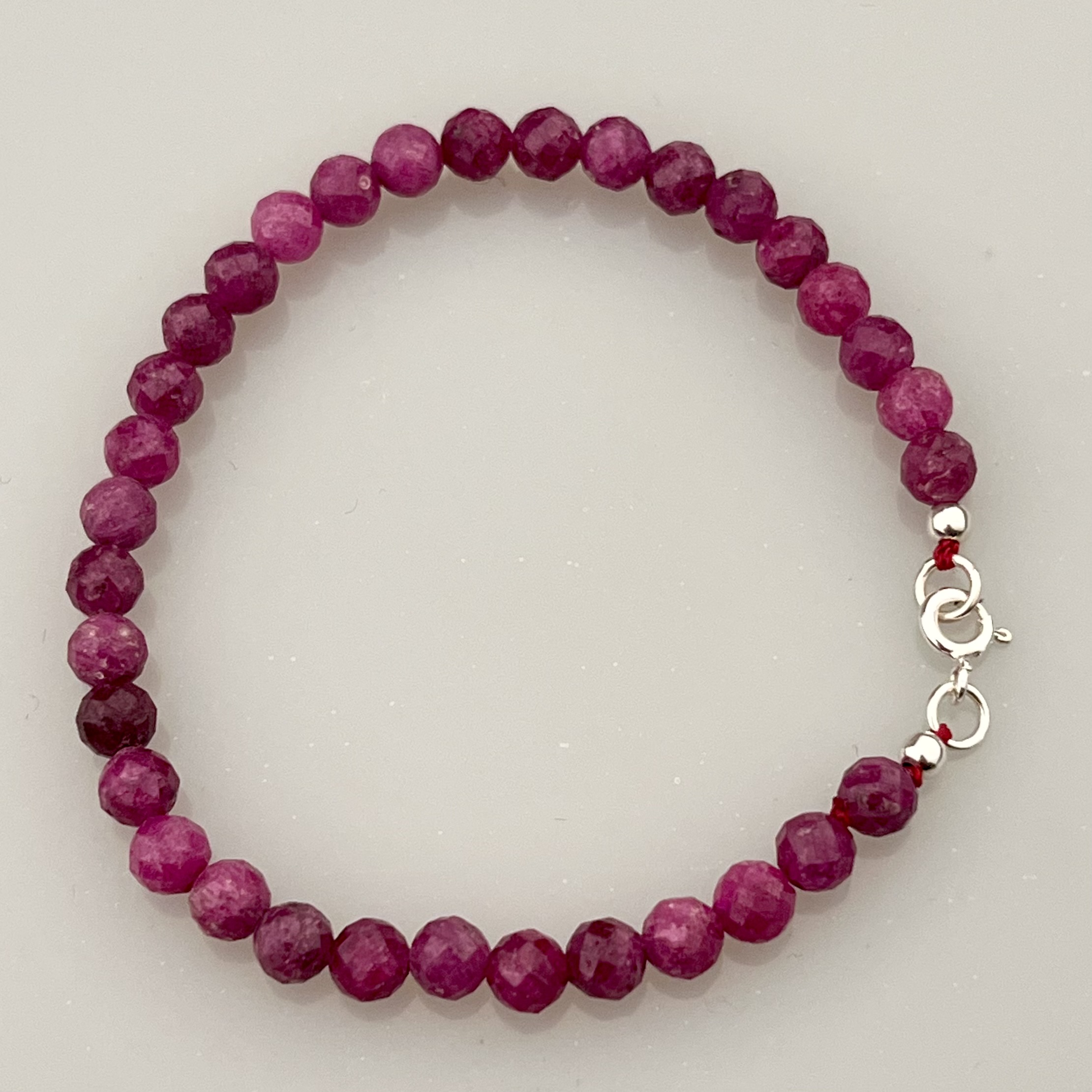 Náramek navlečený z broušených rubínů o velikosti cca 5mm, na niti, se stříbrným (Ag 925/1000) uzávěrem. Celková délka cca 18cm.