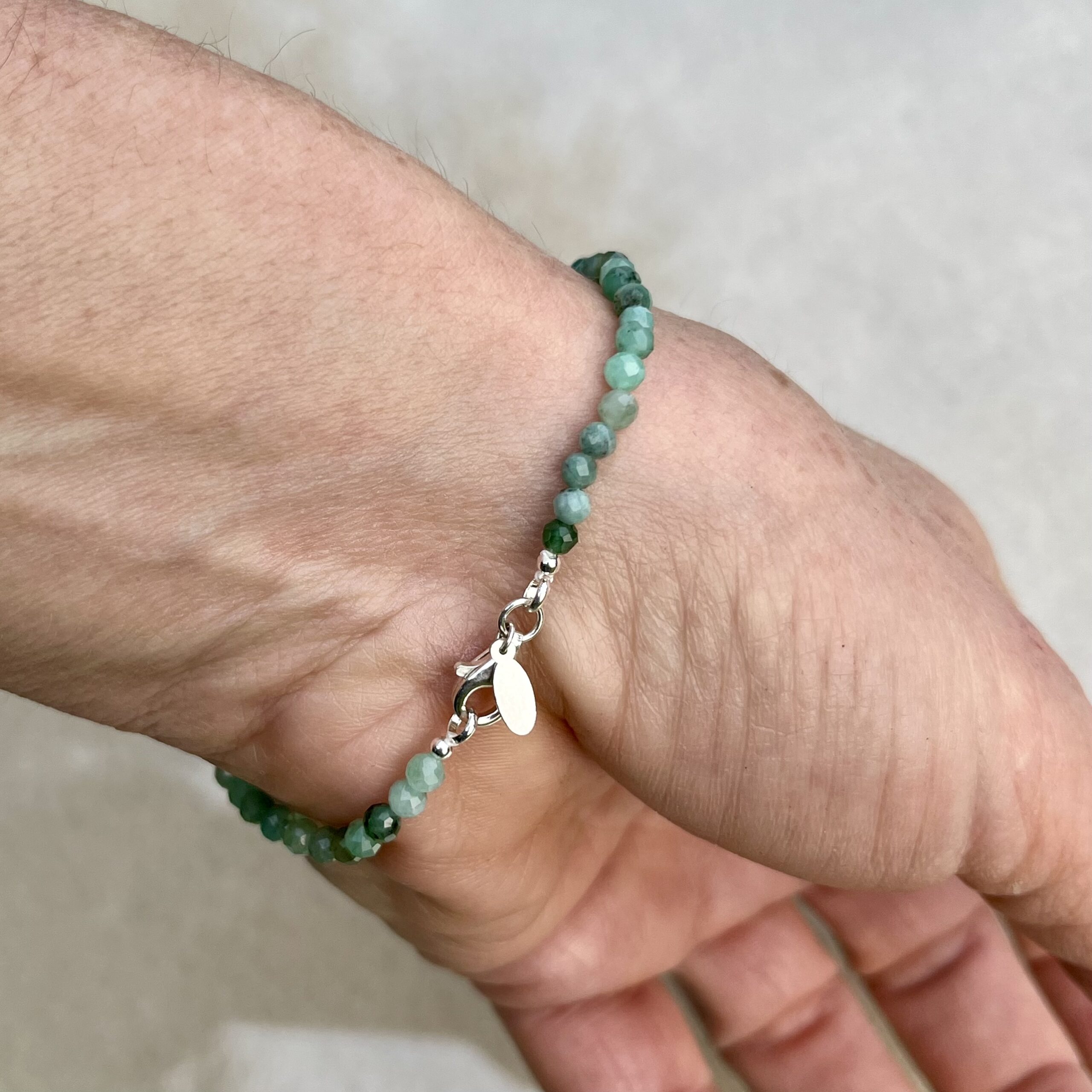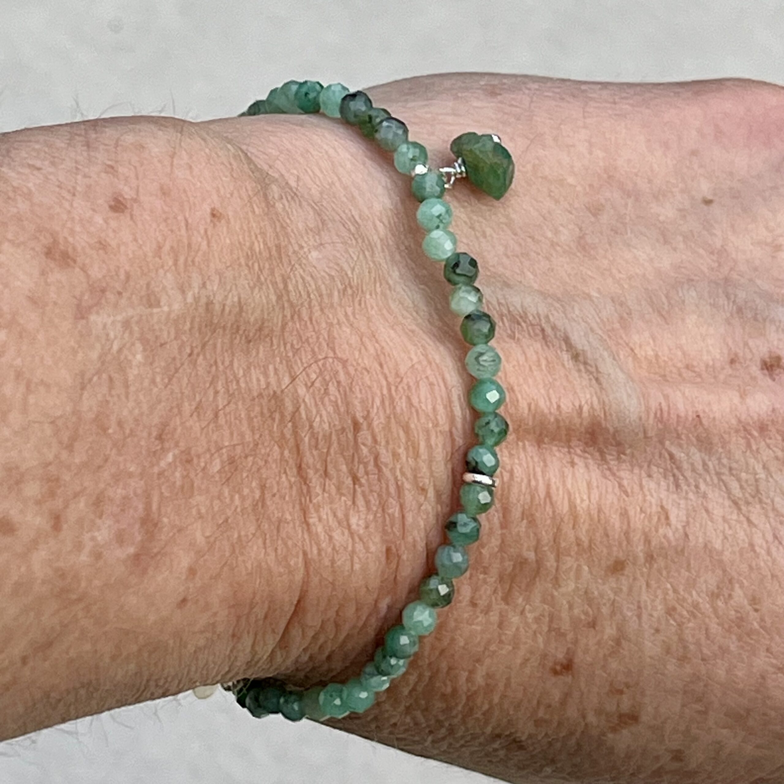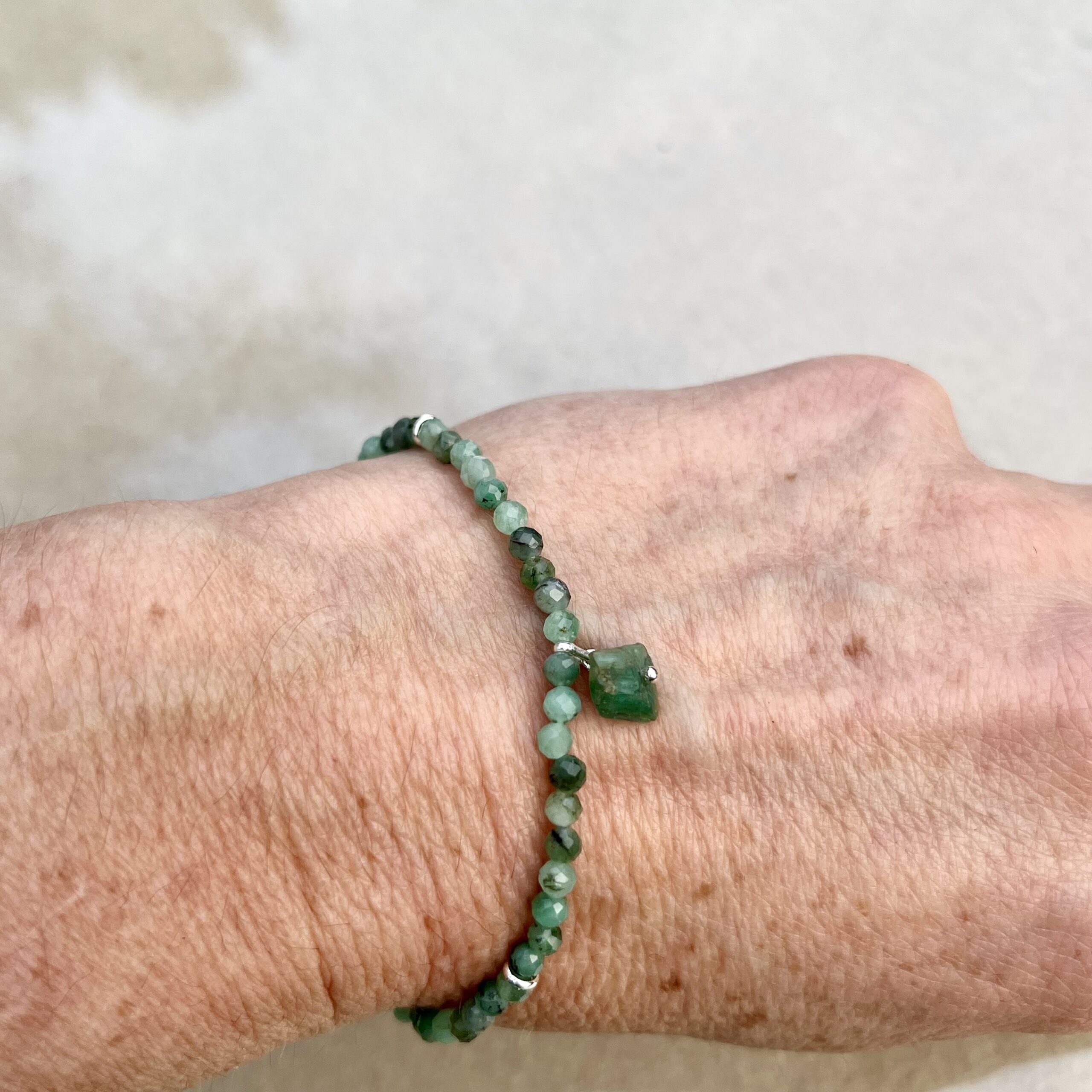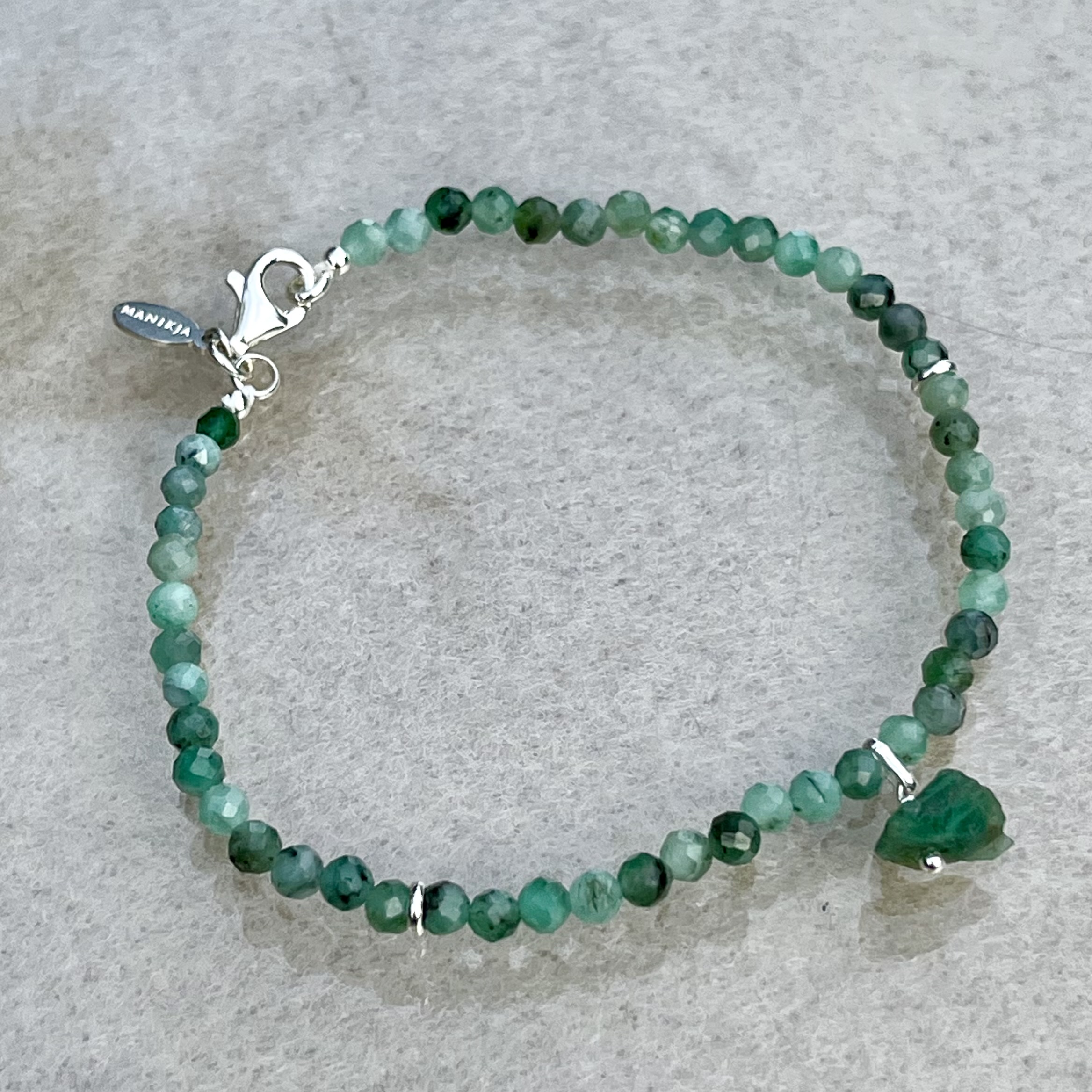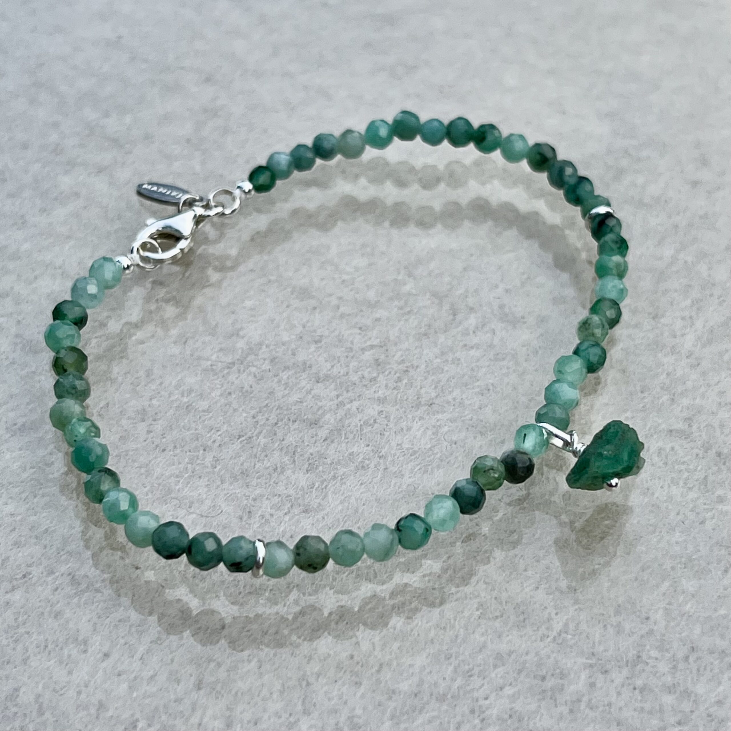Náramek z broušených smaragdových korálků cca 3mm velkých, v pěkné kvalitě a barvě, navlečených na niti, se stříbrným Ag 925/1000 uzávěrem a přívěskem ze surového Smaragdu. Celková délka cca 18cm.